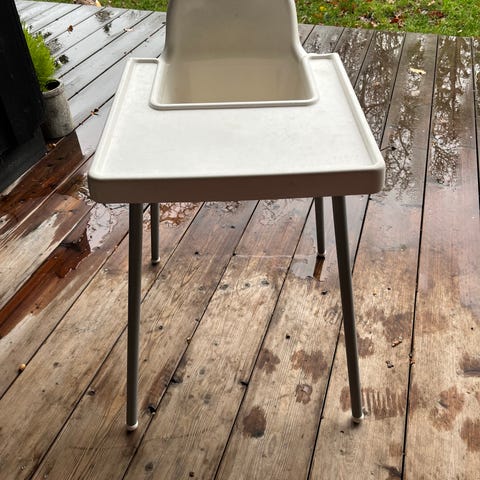 IKEA højstol til børn i hvid plast med grå ben. Designet til at give sikkerhed og komfort under måltider. Velegnet til brug ved spisebordet for små børn.