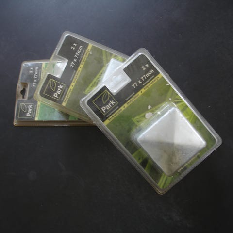 Stolpetoppe, Ganske fine stolpetoppe, overskud. Både blanke & matte. Mål: ca. 71x71mm, type 3”, A. Galvaniseret.