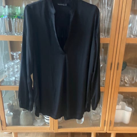 Stills sort bluse i størrelse L med et brystmål på cirka 92 cm, når blusen ligger på bordet og en længde på cirka 70 cm. Bemærk at ginens brystmål er cirka 104 cm. Blusen er lavet af 100% nylon. Blusen har lange ærmer med gennemsigtigt materiale og en rund halsudskæring. Blusen er 2 lags, det yderste lag er tilsvarende det du ser ved ærmerne se billede 2, medens der på torsoen er en "inderbluse".