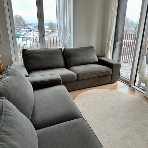 Farven er grå/grøn. Super flot. Passer til 2,5 pers.