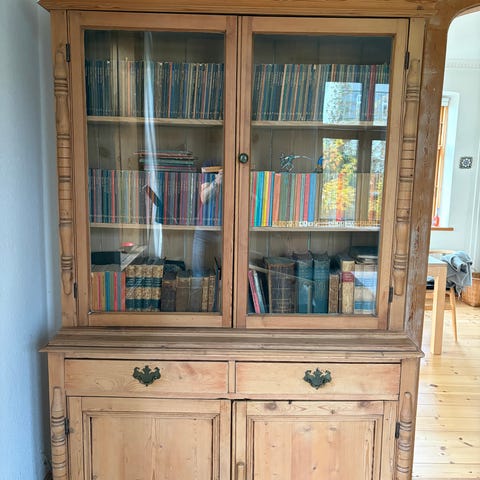 Vitrineskab i hvidt træ med glaslåger og åbne hylder. Skabet har flere opbevaringsrum og en skuffe, hvilket gør det velegnet til opbevaring og udstilling af genstande. MEGA TUNGT :-)
