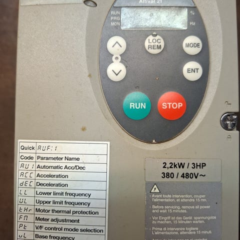2,2kW frekvensomformer ATV28EU41M2 til hastighedsregulering af 3-faset motor. Tilkobles 1-fase 230-240V. Manual kan hentes på nettet!