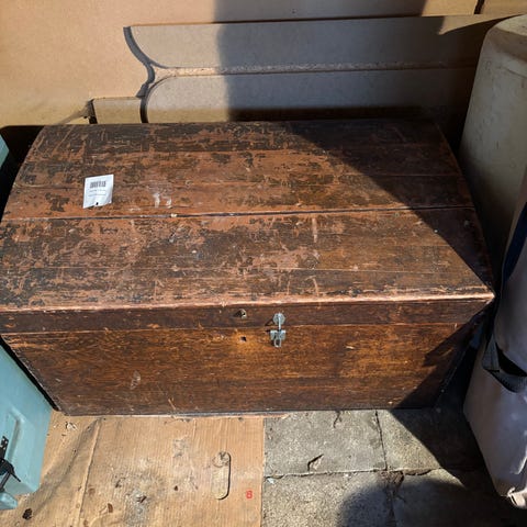 Antik trækiste med metalbeslag. Kisten er lavet af træ og har et rustikt udseende med synlige tegn på alder og brug. Den har en rektangulær form og kan anvendes til opbevaring eller som dekorativt møbel.sælges for Lions Club Hellerup