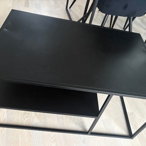 Sort bord med gulddetaljer på ben og kanter. Bordet har en rektangulær bordplade og firkantede ben. Materiale ikke specificeret. Sælges fort Lions Club Hellerup