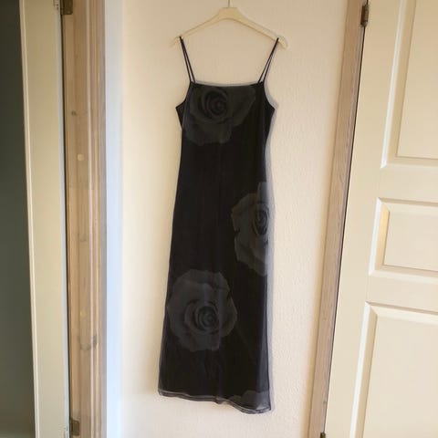 Meget strækbart materiale. Festkjole som går til midt på skinnebenet.