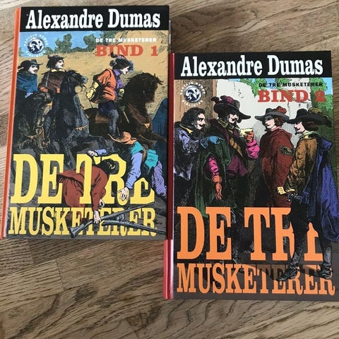 De tre musketerer, Alexandre Dumas , genre: eventyr, 2 x hardback, indbundet, 389 / 390 sider, år 2000