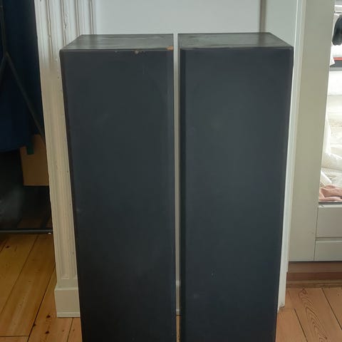DALI 104 gulvhøjttalere i sort finish. Højttalerne har flere drivere inklusive bas, mellemtone og diskant for lydgengivelse over flere frekvensområder. Kabinettet er udført i sort trælook med basrefleksport bagpå. Tilslutningerne er placeret på bagsiden af hver højttaler.