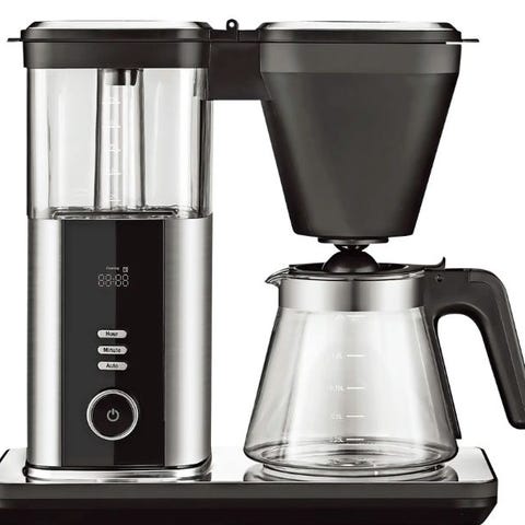 Sort kaffemaskine med tilhørende glaskande og er designet til at brygge kaffe med præcision. Den har en kompakt størrelse og et moderne design, der passer til de fleste køkkener.