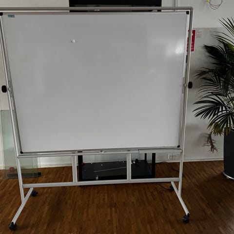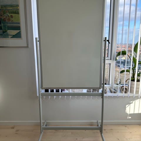 White board wide baord tavle på hjul med kraftigt stativ. Vendbar. Tavle str ca 1 m x 0.7 m (hxb). Højde med stativ ca 1.9 meter. Kan også anvendes til flip over (med papir). Afhentes ved Sorø