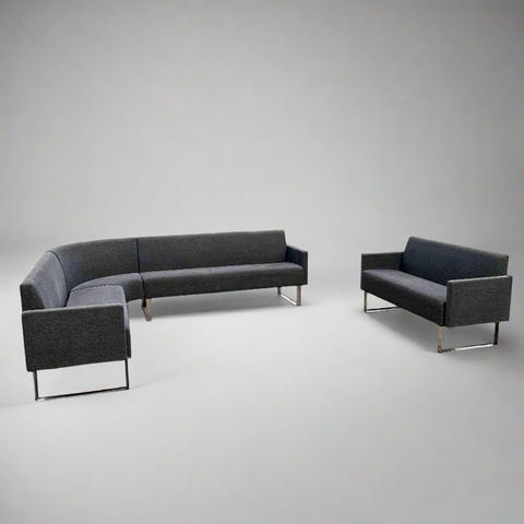 Materia Longo kurvet bænk med tilhørende to runde stole ("Rondo"). Kompakt, let og elegant. Designet af Komplet Design for Materia i Sverige. Som nyt. Tilhørende runde acryl plader transformerer de runde stole til et midlertidigt bord. Sælges samlet. Afhentes ved Sorø.