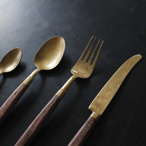 Smukt sæt vintage italienske messing skeer og gaffel, alle stemplet “Italy / Made in Italy”.