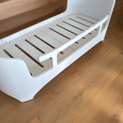 Leander Juniorseng i hvid. Sengen har enkelte skræmmer men fremstår ellers rigtig fint, dog pt godt pyntet af klistermærker. Madrassen kan medfølge, lynlåsen er dog ødelagt på hovedmadrassen.