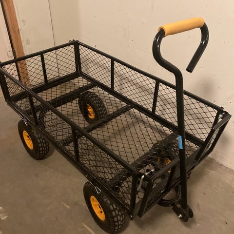 Transportvogn med træbund og orange håndtag