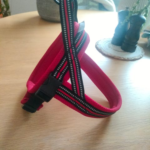 Hurtta sele til hund i grå og rød farve. Justerbare stropper med klikspænder for nem tilpasning. Designet til komfort og sikkerhed under gåture. Til stor hund.