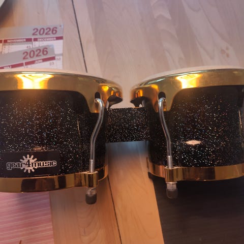 Bongotrommer - med alm. mærker efter brug. Som det ses af fotos, kan trommerne adskilles med en vingemøtrik, ligesom trommeskindene kan justeres. Vejledende nypris 1.049 kr. Udsalgspris 699 kr. Min DBA-pris: 400 kr.