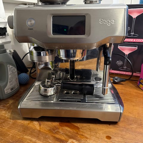 Sælger min ca 2 år gamle Sage Oracle med dualboiler, da jeg gerne vil opgradere mit setup til rotationspumpe osv. Den kører perfekt og laver fantastisk espresso og gennemført skum både på auto og manuel. . Jeg har lavet ca 2 skud hver dag og har KUN kørt med mineralvand, så den har aldrig smagt vand fra vandhanen. Der følger 2stk portafiltre med 22g kurve med samt knockbox og Sage tamper. Der følger også en Sage Pucksucker ...... Denne model står p.t. til 16999 på tilbud i elgiganten UDEN ekstra portafilter, pucksucker og tamper osv.. Sender gerne flere billeder ved efterspørgsel.