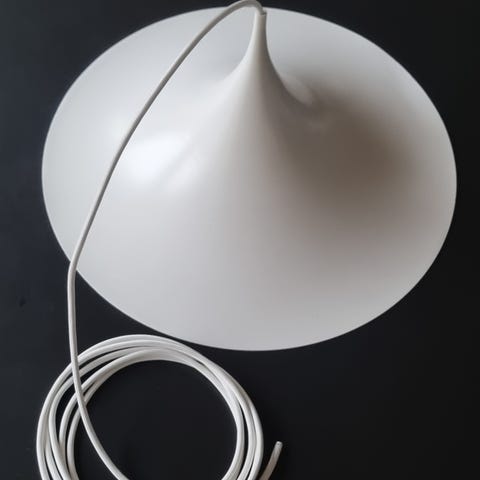 Jeg sælger denne gamle klassiker fra Fog og Mørup, også kaldet trompetlampe. Semi pendlen er designet af de to kreative arkitekter Claus Bonderup og Torsten Thorup tilbage i 1968. Den måler 38 cm i diameter og er i farven hvid (mat). Lampen er i rigtig fin stand men har selvfølgelig lidt brugsspor efter mere end 50 år på bagen.