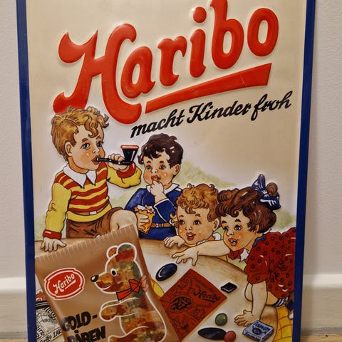 Metalskilt med påtrykt motiv: “Haribo macht Kinder froh”
