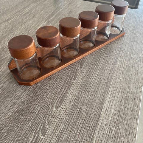 Retro krydderisæt i glas med teak træ bakke