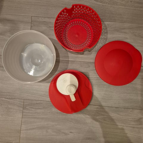 Tupperware salatslynge, salat opbevaring, skyl, slyng , derefter tør, opbevaring og servering.