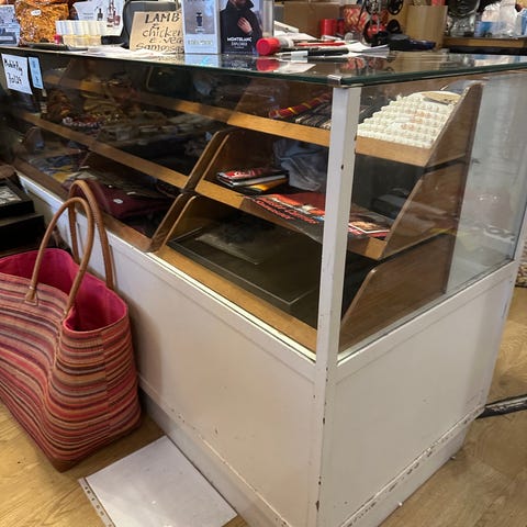 Vintage butiksdisk med glas og skuffer til display af varer. Butiksdisken er i god, brugbar stand.