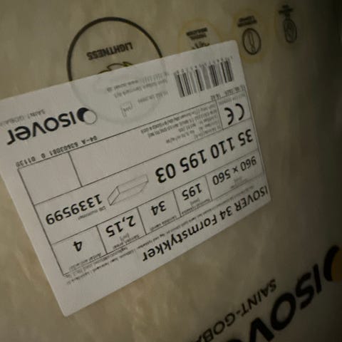 Isover Formstykker isoleringsmateriale med dimensionerne 960 x 560 x 195 mm og en densitet på 37 kg/m³. Produktet har en varmeledningsevne på 0,029 W/m·K og er klassificeret i brandklasse S.