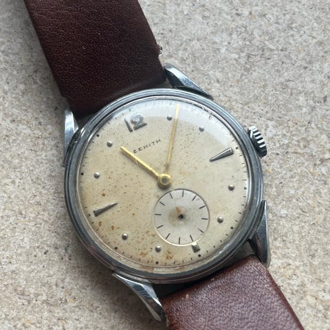 Den brune læderrem understreger urets robuste karakter, og dens patina fortæller om urets historie, samtidig med at det bevarer sin mekaniske integritet. Zenith Cal. 2572 er et vidnesbyrd om mærkets arv af kvalitet og stil, ideelt for samlere og entusiaster.