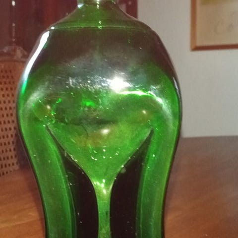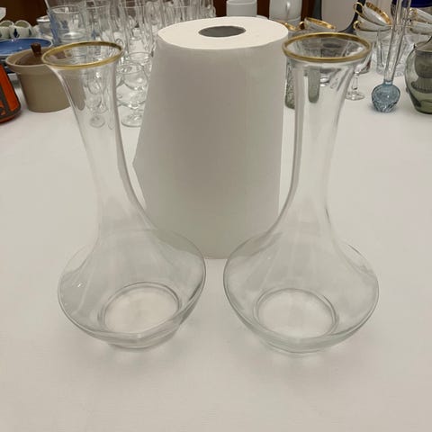 Hivert karafler fra Holmegaard / Odense Glasværk - hvorfor den ene grønne er mørkere end den anden ved jeg ikke , ALLE 3 er 100% rengjorte. Propperne er ikke originale. Tinpladen på den grønne er "blank" og kan let fjernes.