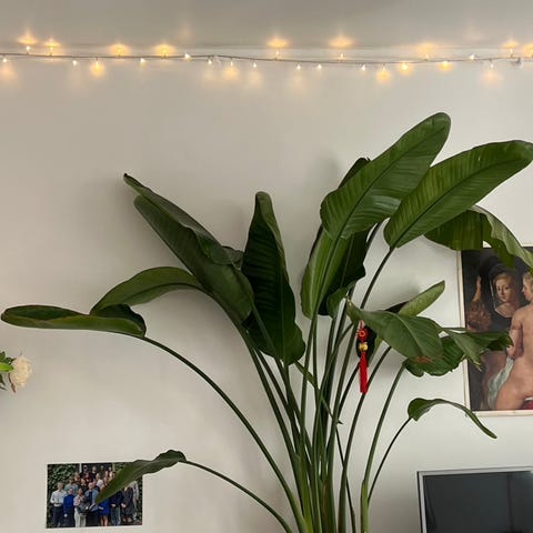 Kæmpe Paradisfugl - over 2 meter høj - med store grønne blade. Planten har tre store stammer og masser af blade.