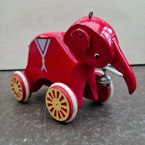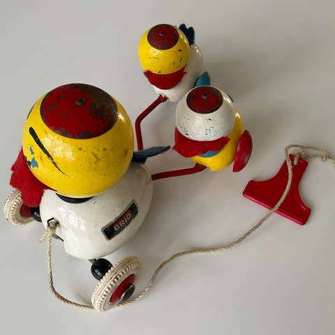 Legetøj, Brio "De tre ænder" 1965, Klassikeren fra Brio. Naturligvis i træ. Fra 1965. Ællingernes fødder drejer rundt når den trilles. Med let snavs og slid hist og her, let rust på deres røde metalhatte. Skal lige have en kærlig hånd så stpr de flot. Komplet og sjældne! Super flotte!!