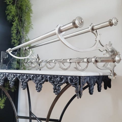 Vintage, eksklusivt slipsestativ til mænd er den perfekte løsning til at organisere dit klædeskab. Kan også indeholde dametørklæder, bælter eller halskæder. Lavet i Italien, cirka 1960'erne. Måler 44 cm i længden x 6 cm i højden og har 23 bøjler