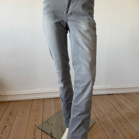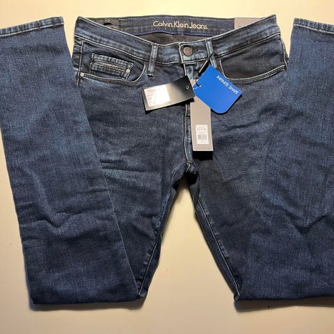 Et par flotte blå Calvin Klein skinny Jeans med „lige“ ben, som ender smallere uden at være slim. De er brugt 2-3 gange og derfor 100% ok. Stoffet er „tyndere“ end det typiske Denimstof og derfor mindre varme end Jeans. Se ca mål på fotos (72/38cm) og skriv gerne, hvis du vil vide mere.