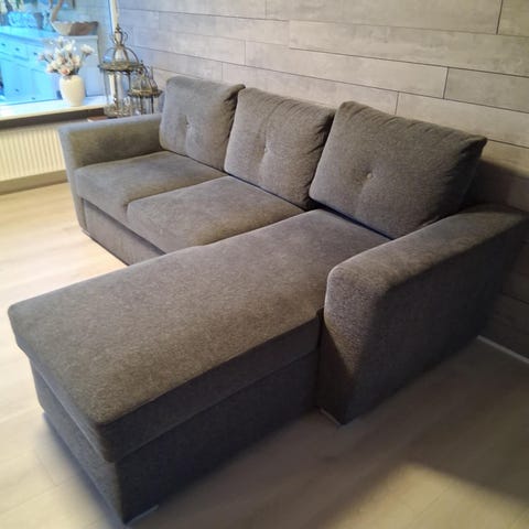 Sovesofa med mulighed for udtræk til seng og stor opbevaring i chaislong med plads til to dyner, puder og sengetøj