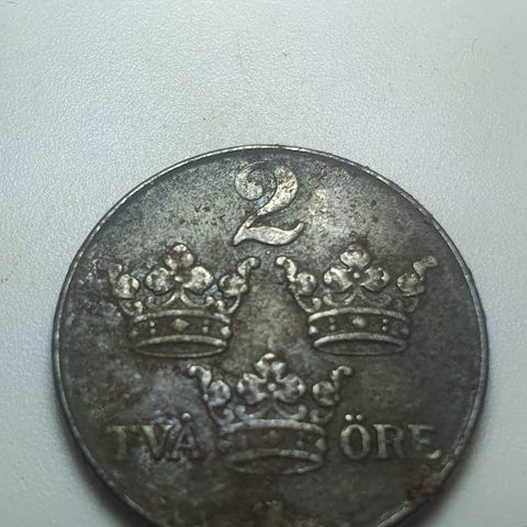 Sverige 2 Øre mønt med kongeligt monogram på den ene side. Mønten er fremstillet af metal og har et cirkulært design. Den anvendes som samlermønt.