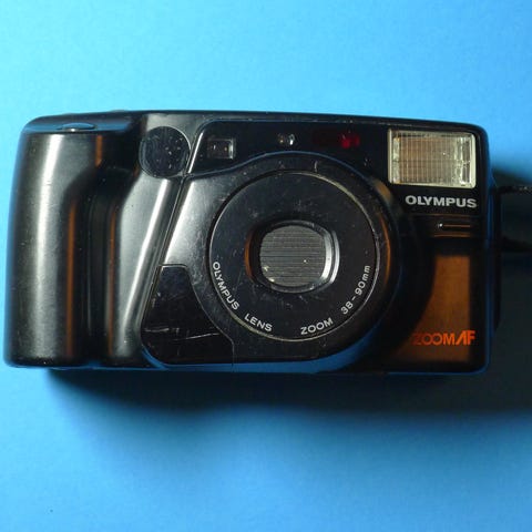 Olympus AF-200 Superzoom Kamera med optisk zoomfunktion. Kameraet har en sort krop og inkluderer en indbygget blitz. Designet til brug med film, velegnet til fotografering i forskellige situationer.