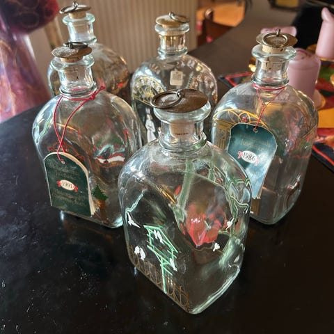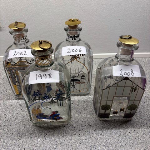 Holmegaard juleflasker - 3 stk. Holmegaard Christmas flaske i glas. I fin stand. Ca. 19 cm høje, 9 cm brede og 7 cm dybe.