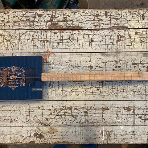 3 strenget guitar med humbucker pickup. Hals af birketræs køkkenbord og gribebræt af noget andet smukt... Halsen er forstærket med kulfiberstang. Volume knap, Kluson stemmeskruer, 20 bånd. Ernie Ball strengene '15-'24w-'34 for mere info, se på cigarkasse.dk