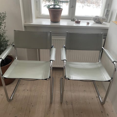 Begge stole i super god stand. Patineret let og smukt, og ingen fejl. Alle syninger er intakte, kromstel flot og smukt læder.