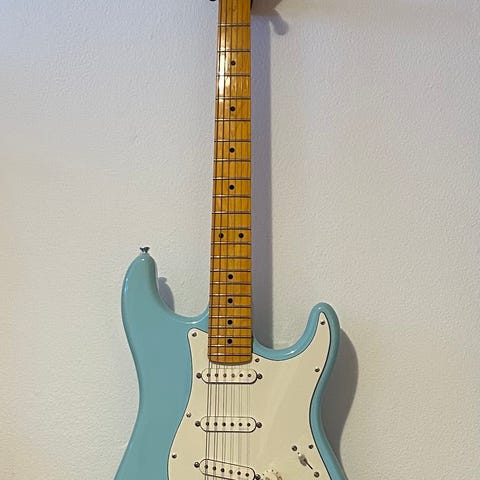 3 strenget guitar med single-coil pickup. Hals af birketræ køkkenbord, gribebræt af antikt mahogni (min forældres spisebord...). Haglpatron volume knap, Kluson stemmeskruer, 20 bånd. Ernie Ball strengene '15-'24w-'34. Halsen er forstærket med en kulfiberstang. Kan sendes for 100,- For mere info se cigarkasse.dk