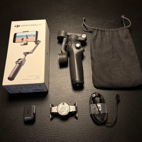 DJI fjernbetjening til kamera med kompakt design og flere kontrolknapper. Enheden har et håndtag med stroppemulighed for bedre greb og stabilitet under brug.
