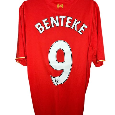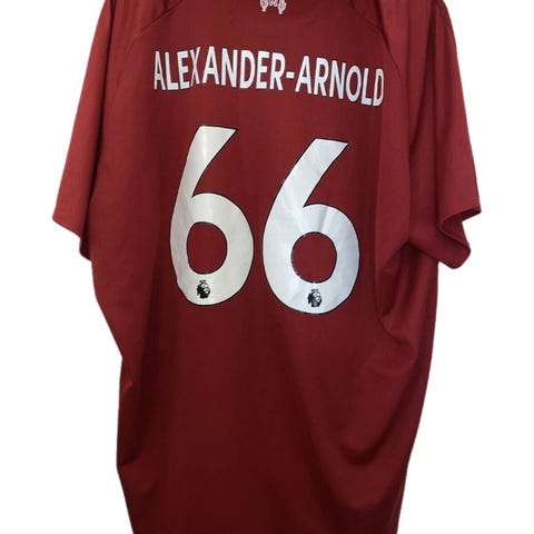 Liverpool F.C. fodboldtrøjer med navne og numre på ryggen: Coutinho 10, Agger 5, Benteke 9 og Mané 19 Alexander Arnold 66. Trøjerne har både korte og lange ærmer og er i farverne rød og sort. Materiale og størrelse er ikke angivet.