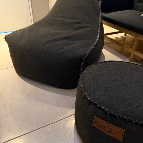Mørkegrå sækkestol til udendørs brug. Måler 70 x 80 x 90 cm og vejer ca. 5 kg. Fin stand. Kan tåle det meste og er meget anvendelig. Også meget nem at flytte rundt med.