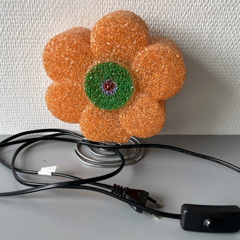 Pop Art design. Flot og meget velholdt lampe i plast. Med meget få brugsmærker. H: ca. 150 cm. Skærmdiameter: ca. 30 cm. Bud modtages.
