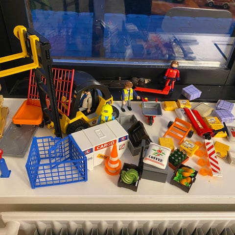 Playmobil gaffeltruck legetøj med en figur. farver : orange, gul, blå, rød og grøn.