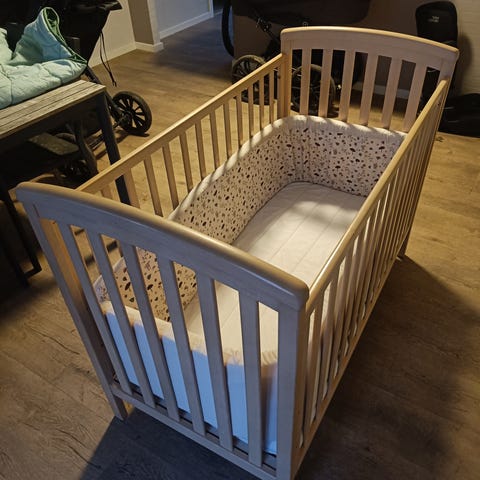 Tremmeseng børneseng med polstret kantpude i farverigt mønster. Sengen har tremmer og en madras med quiltet betræk. Kantpuden langs sengens indvendige sider for ekstra beskyttelse. Br. Indv. Mål 62 cm udv. Mål 64 cm. Længde 120 cm. Højde 79 cm. Rejseseng medfølger