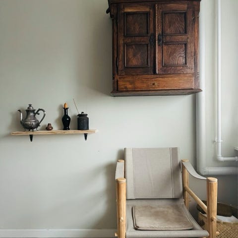 Stol med træramme og sæde samt ryg i cognacfarvet imiteret læder. Stolens design inkluderer en robust træstruktur med læderbeklædning på sædet og ryggen. Egnet til brug i hjem eller kontor som siddeplads.,
