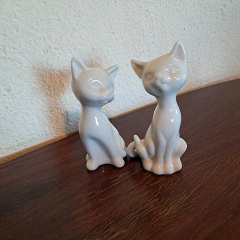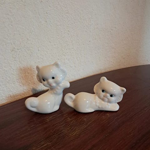 Keramikfigur af en siddende kat i hvid, sort og grå glasur. Figuren er ca. 11,5 cm høj og har et håndskrevet nummer på undersiden. Overfladen har en fin blank glasur og fremstår i pæn stand med lette aldersspor, men uden synlige skader. Figuren vurderes at være fra 1960’erne–1980’erne. En charmerende og dekorativ lille kattefigur, der passer perfekt til reolen, vindueskarmen eller som samlerobjekt.