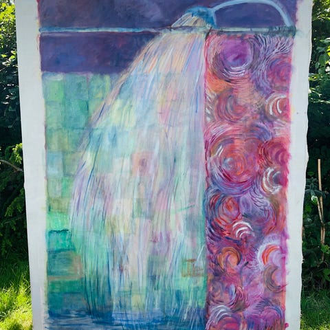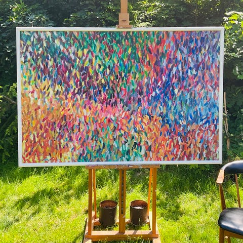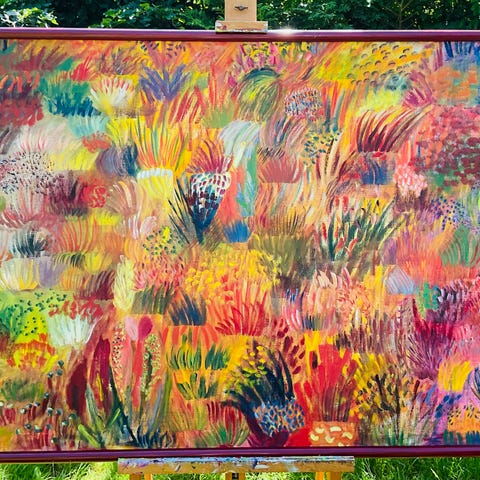 Maleri med ramme. Olie på lærred. Måler 140cm x 110cm. “Bourgogne blomsterhoveder”. Kunstner Eva Karin Thomsen.