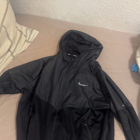 Sort sports jakke fra Nike, m. lynlås lommer og snor til at justere ind ved hoften. Der er reflekser langs lynlåsen foran og henover ryggen.