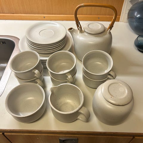 Arabia keramik kafferservise bestående af 2 kopper, 4 underkopper, 4 tallerkener og 1 tekande 2 dybe tallerkner 1 stort rundt fad 1 fløde kande Serviset har en brun farve og er fremstillet i keramik. Designet til brug ved servering af kaffe og te og spisning